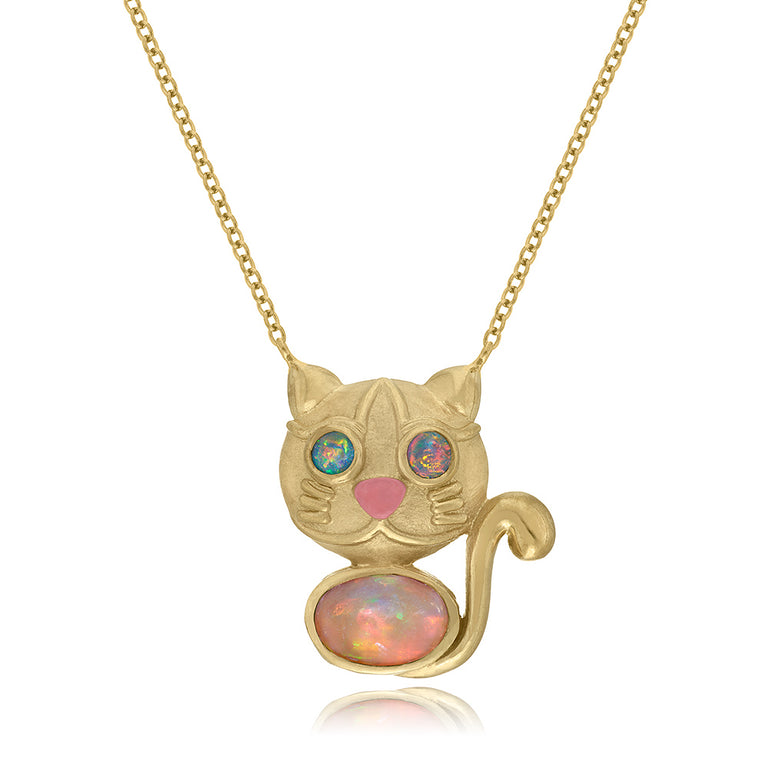 This captivating cat plays lovingly with anything you wear and attracts admiring attention from anyone she meets. 18k yellow gold plated polished silver, opal cabochon belly, bezel-set opal eyes, orange pink enameled nose detail. 3 mm Opal, 4x6mm Opal and Orange Pink enamel.  20 x 15 x6 mm, 20 inch chain.