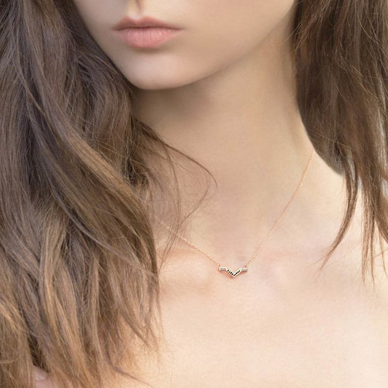 Playing on the theme of positive and negative geometry, the Collection’s striking interactive shapes are elegantly enhanced by rows of finely set black diamonds in complementary orientations. Available in 14k rose gold. 25 x 20 x 4 mm, 16 inch chain.