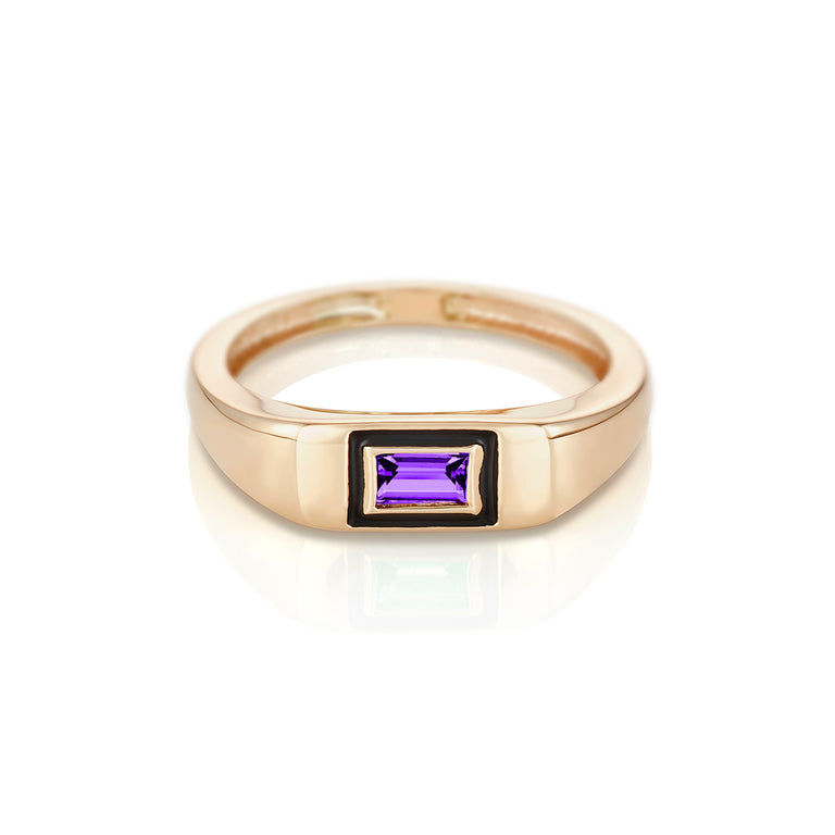 2x4mm Baguette Amethyst set in 14k yellow gold with black enamel surrounding. February Birthstone.