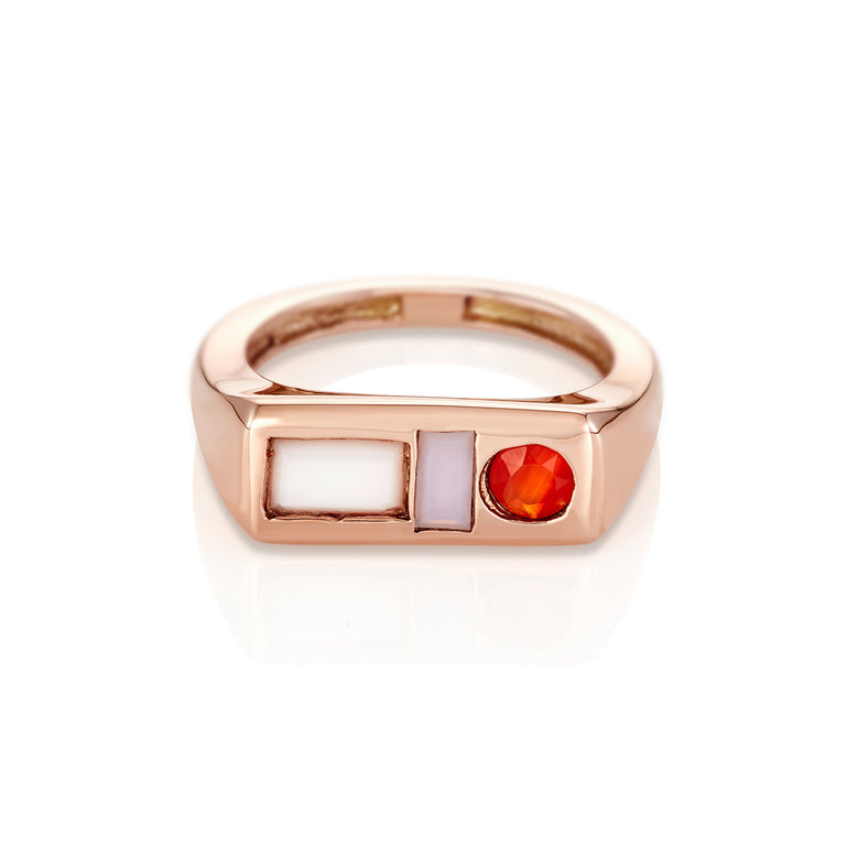 S/H KOH signet ring designs reflect the 20th century modernist art with geometric stone shapes as basic as rounds, squares and triangles. This ring is made in 14k rose gold with 6x4 mm Baguette Mother of Pearl, 5x2.5 mm Baguette blue Agate, and 4mm round Carnelian with shiny finish.