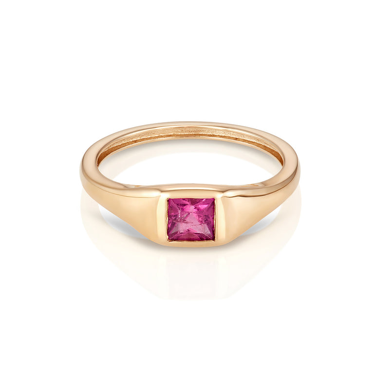 S/H KOH signet ring designs reflect the 20th century modernist art with geometric stone shapes as basic as rounds, squares and triangles. This ring is made in 14k Yellow gold with 4 mm Square Pink Tourmaline with shiny finish.