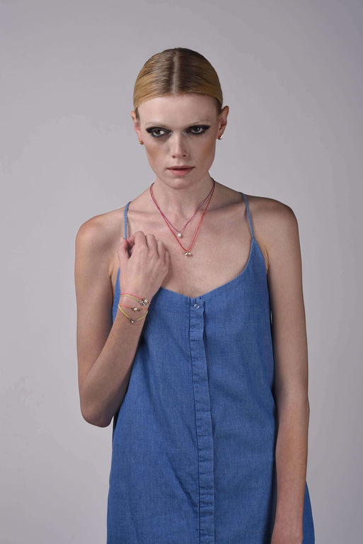 The use of color gives this lovely Collection of S/H KOH Fine Jewelry its own special appeal. Simple color cords set off lustrous pearls and luminescent diamonds in eye-catching 14K yellow gold settings that playfully catch the light. The Iris pendants and necklaces work beautifully worn solo as well as in multiples, or paired with pieces from other S/H KOH Collections. The geometric Onda element with 5.5 mm Akoya cultured pearl is combined in this pendant with red color cord enhancing the yellow gold. 10 x 10 x 8 mm, 16 inch color cord.