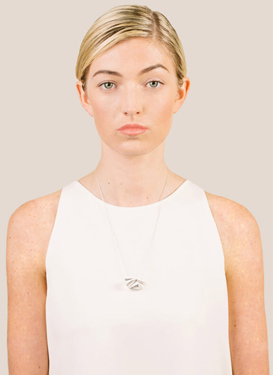 The wavelike sculptural form of this unique pendant is heightened by gentle folds that seemingly undulate in triangles of light and shadow. With every move the play of light and shape shifts. An elegant and eye-catching statement piece that quietly enhances any look. Sterling Silver and gold plated with textured finish. 36 x 20 x 18 mm; 22” fine cable chain with spring ring closure.