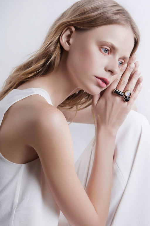 18k-gold plated dome setting with black enamel radial design beautifully sets off moonstone cabochon. Sleek rounded band accentuates the ring’s modern appeal. 18k gold plated matte finish in sterling silver. 12mm Round Moonstone Cab. 20 x 15 x 15 mm.