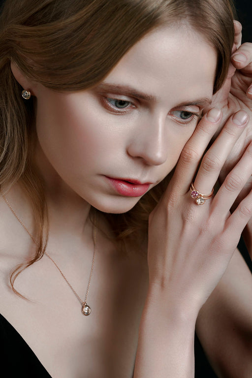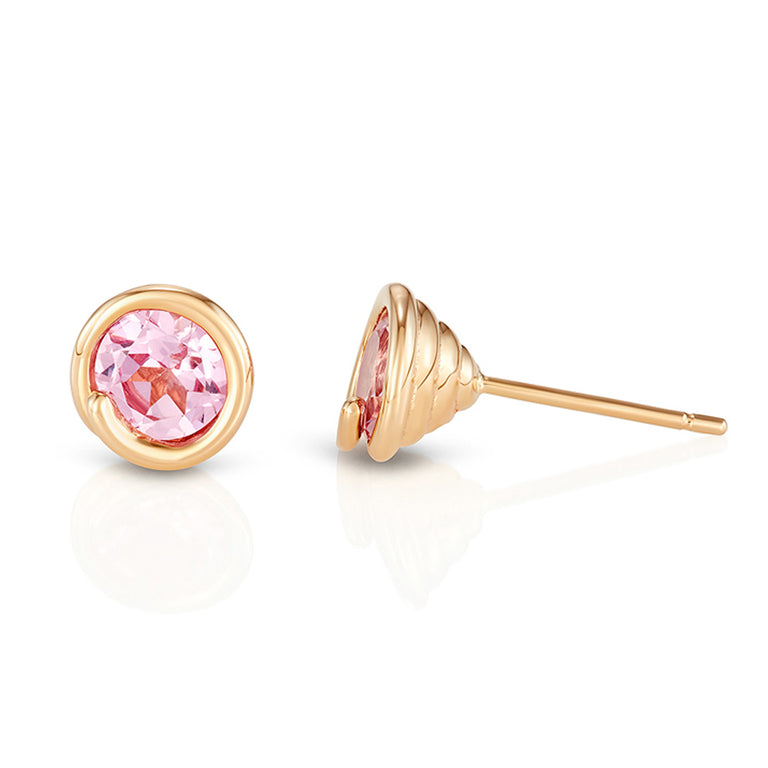 Brilliant pink faceted topaz is beautifully ensconced in a swirl of 14k yellow gold with fine wire post. The succinctly feminine design in thisfine jewelry earring is simple enough for everyday and elegant enough for evening. 6mm round Pink Topaz.