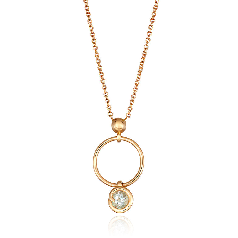 Aquamarine is beautifully ensconced in a swirl of 14k yellow gold in thisfine jewelry Pendant. The succinctly feminine design is simple enough for everyday and elegant enough for evening. 4mm round Aquamarine. 16 inch chain.