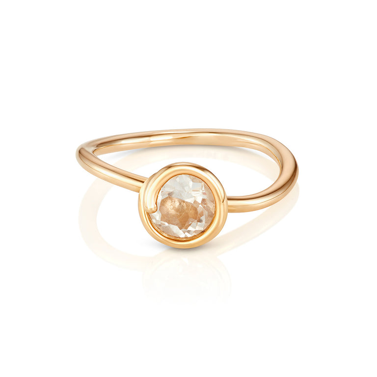 Brilliant white faceted topaz is the focal point of this graceful fine jewelry ring design. The lovely scroll setting is complemented by the flowing curves of a gently twisting band, all in 14k yellow gold. Perfect alone or stacked. 6mm round white topaz.