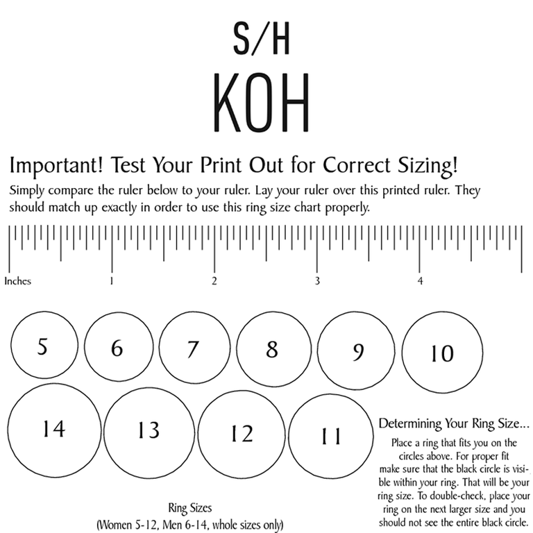 First, click on the image below, download, and print. Simply compare the ruler below to your ruler to match up exactly in order to use this ring size chart properly. Place your ring on the circles below. For the half sizes, please determine if your ring falls between two of the circles.